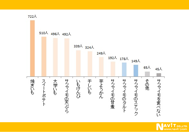 好きなサツモイモ料理(複数回答可)については、1人平均3.7回答していました。「焼き芋」が722人でトップでした。2位に入っている「スイートポテト」(510人)は、日本では洋風のサツマイモ菓子のことですが、サツマイモは英語で「sweet potato」と言いますから、外国人から見ると「?」でしょうね。