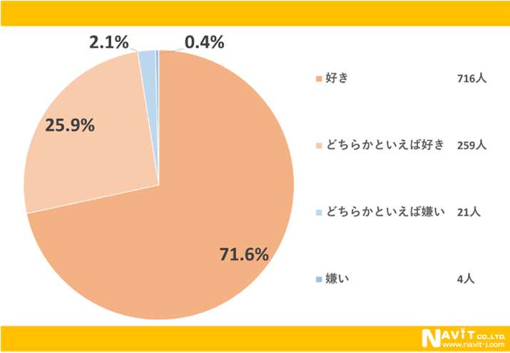 あなたは餃子が好きですか?という質問に対して「好き」と「どちらかといえば好き」を合わせると97.5%もいらっしゃいます。ほぼ全ての人が餃子に対して好印象なようです。「好き」だけでも71.6%というのが凄いですね。