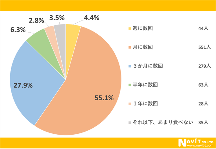餃子を食べる頻度の質問では「月に数回」という回答が1番多く55.1%となっています。次に多かったのが「3か月に数回」という回答が27.9%でした。