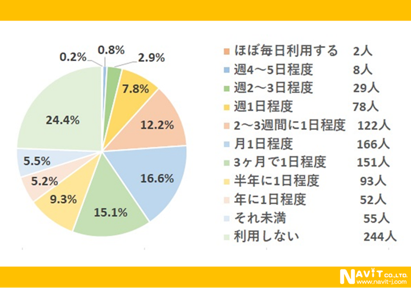 利用頻度が最も多いのは「月1日程度」で166人。割合は回答者の6分の1。次に多いのが「3ヶ月で1日程度」151人と「2~3週間に1日程度」122人となっています。