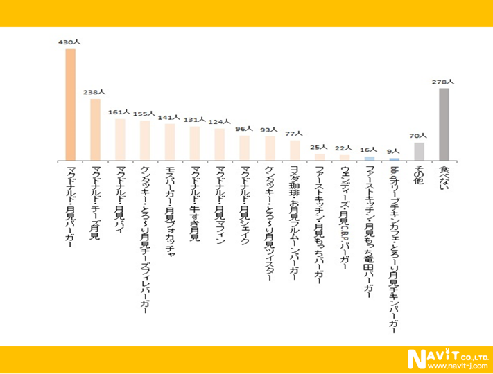 アンケートでシェアの高かったマクドナルドをはじめ、モスバーガー、ケンタッキー、コメダ珈琲店など大手のチェーン店は8月末から9月にかけて「月見」と銘打った商品を期間限定や数量限定で販売。毎年新商品を登場させるところが目立ちます。