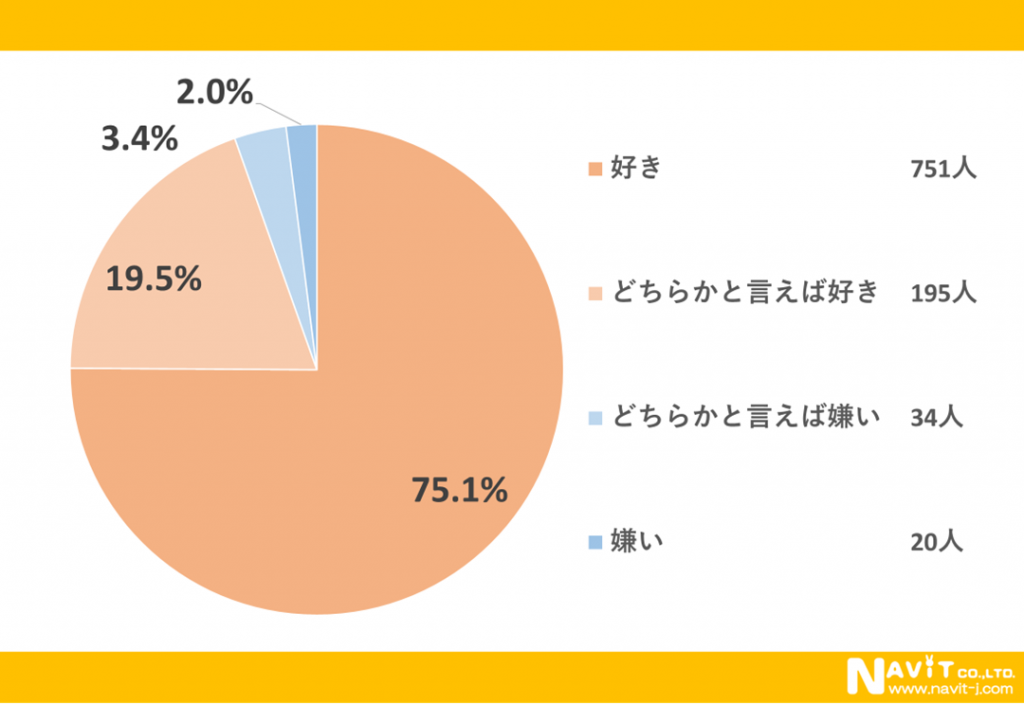 お肉が「好き」という方は75.1%で「どちらかと言えば好き」という方が19.5%いらっしゃいます。合計すると94.6%の方がお肉が好きだと言っています。