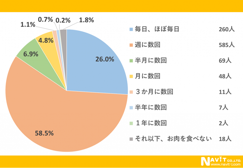 大多数の方がお肉が好きだと回答されていますが、いったいどのくらいの頻度でお肉を食べているのでしょうか。「週に数回」という方が58.5%と一番多く、半数以上を占める結果でした。その次は「毎日、ほぼ毎日」で26.0%。その後は、「半月に数回」(6.9%)、「月に数回」」(4.8%)と続いています。
