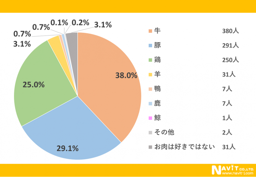 「牛」が1番人気で38.0%となっています。続いてコスパも良く使い勝手も良い「豚」が29.1%と続いています。3番目はに「鶏」で25.0%です。