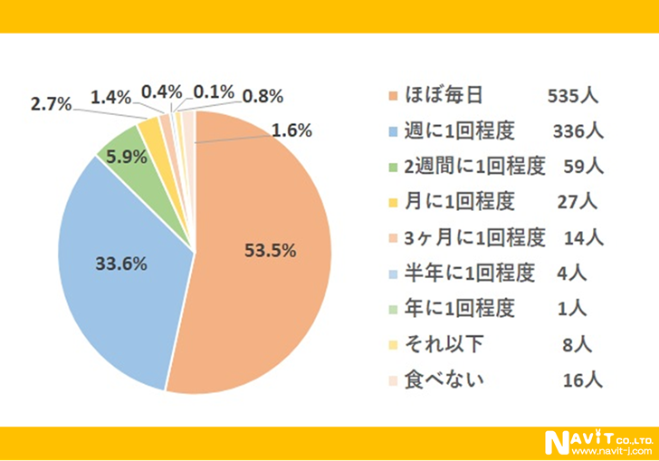 サラダを食べる頻度は「ほぼ毎日」が最も多くて53.5%。次に多いのが「週に1回程度」33.6%となっています。上位2回答だけで総回答数の8割を占める結果となりました。