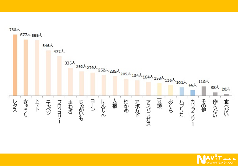 回答数の中で500人以上が挙げたのは「レタス」738人、「きゅうり」677人、「トマト」669人、「キャベツ」546人でした。
