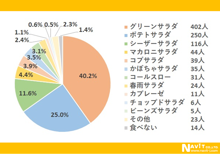 最も好きなサラダのトップは「グリーンサラダ」で40.2%。次いで多いのは「ポテトサラダ」25.0%と「シーザーサラダ」11.6%でした。