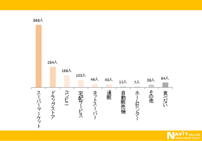 購入する場所を質問したところ「スーパーマーケット」が飛び抜けて多く868人でした。「ドラッグストア」も意外に多くて284人が利用しています。