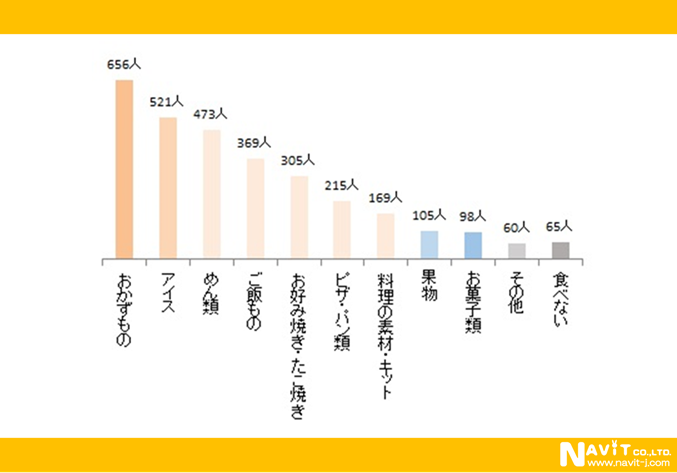 トップは「おかずもの」の656人となりました。次が「アイス」521人、「めん類」473人と続く結果となりました。トップ3が回答数の半分以上を占めています。