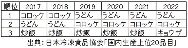 一般社団法人・日本冷凍食品協会のまとめによると、2022年の冷凍食品の国内生産量は約159万トン。金額にすると7,639億円になるそうです。国内生産の品目別の順位を見ると、2019年から「うどん」が1位、「コロッケ」が2位を維持しています。そして、2022年には「ギョウザ」が4位から3位に上がって「炒飯」と入れ替わっています。アンケートの『どの冷凍食品を購入しますか?』とは分類が異なるので単純な比較はできませんが、想像をたくましくして全品目の推移を追ってみると面白い結果が浮かんでくるかもしれません。