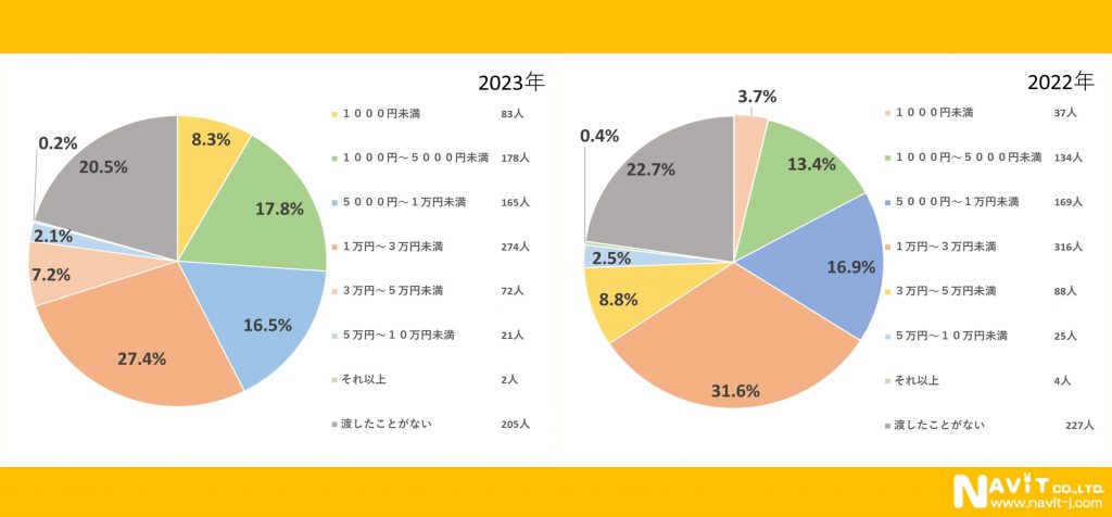 お年玉をあげたことが「ある」と回答されたかたは昨年(76.7%)より2.9%増えた79.6%でした。約8割の方がお年玉をあげたことがあるという回答となっています。