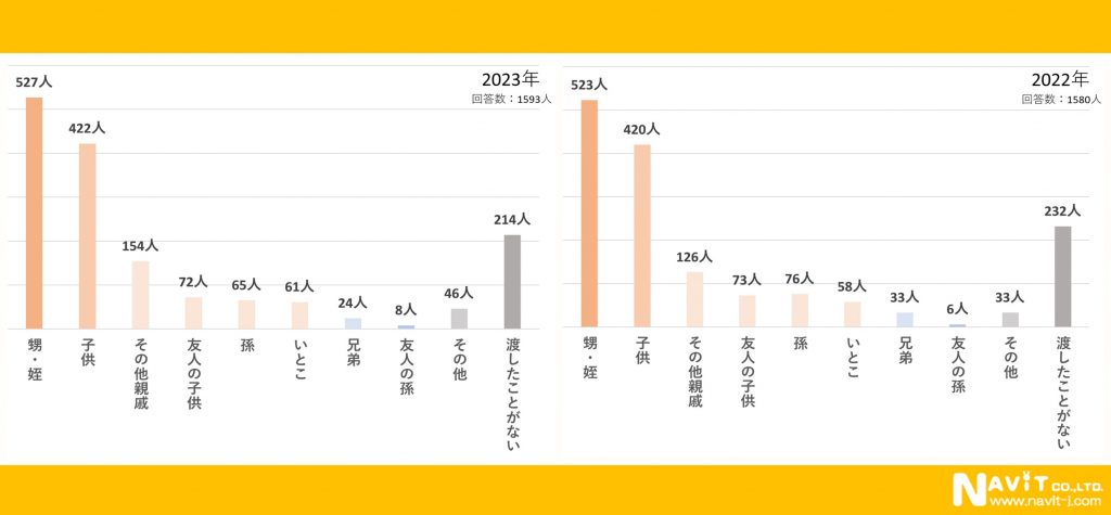 お年玉をだれにあげるかという質問に対して昨年に引き続き1番多かったのが「甥・姪」でえ527人となっています。昨年(523人)よりも4人増えていますが微差です。また「子供」にあげるという方が422人で昨年(420人)より2人増えています。昨年との比較を全体的にみても、傾向はあまり変わっていないようです。