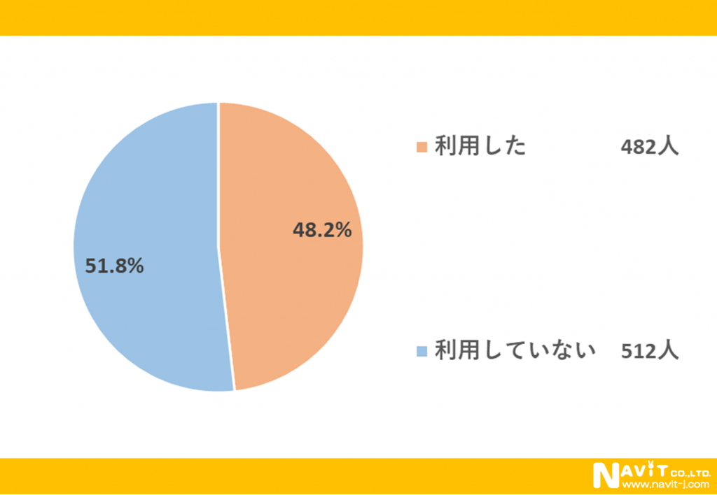 「1年間の間でタクシーを利用しましたか?」という質問については、「利用した」が48.2%、「利用していない」が51.8%という結果になり、半数近くの方がタクシーを利用していたことが分かりました。