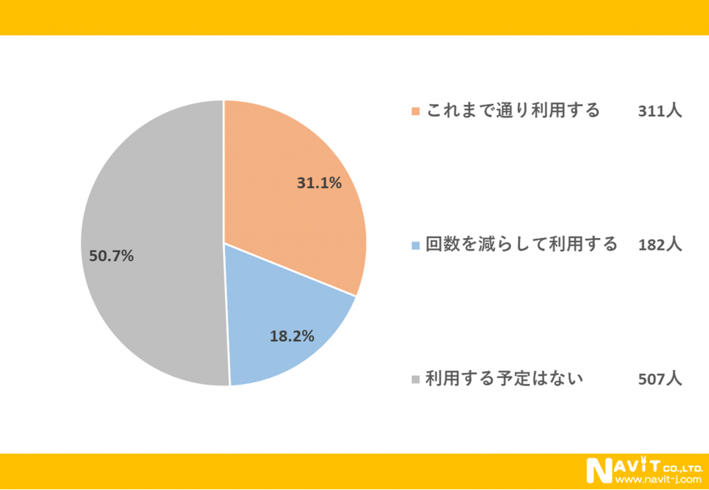 「初乗り料金が値上がりましたが、値上がりしてもタクシーを利用したいですか?」という質問については、「これまで通り利用する」が31.1%、「回数を減らして利用する」が18.2%、「利用する予定はない」が50.7%という結果になりました。