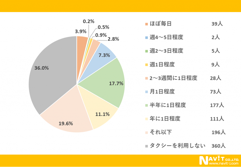 「どのくらいの頻度でタクシーを利用していますか?」という質問については、「(年に1回)それ以下」が19.6%と最も多い回答となりました。「半年に1日程度」が17.7%、「年に1日程度」が11.1%と、皆さんタクシーの利用頻度はあまり多くないようですね。