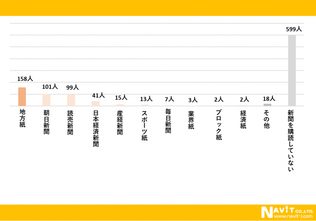 「どの新聞を購入していますか?」という質問を複数回答可で行ったところ、「地方紙」が158人、「朝日新聞」が101人、「読売新聞」が99人という順番になりました。