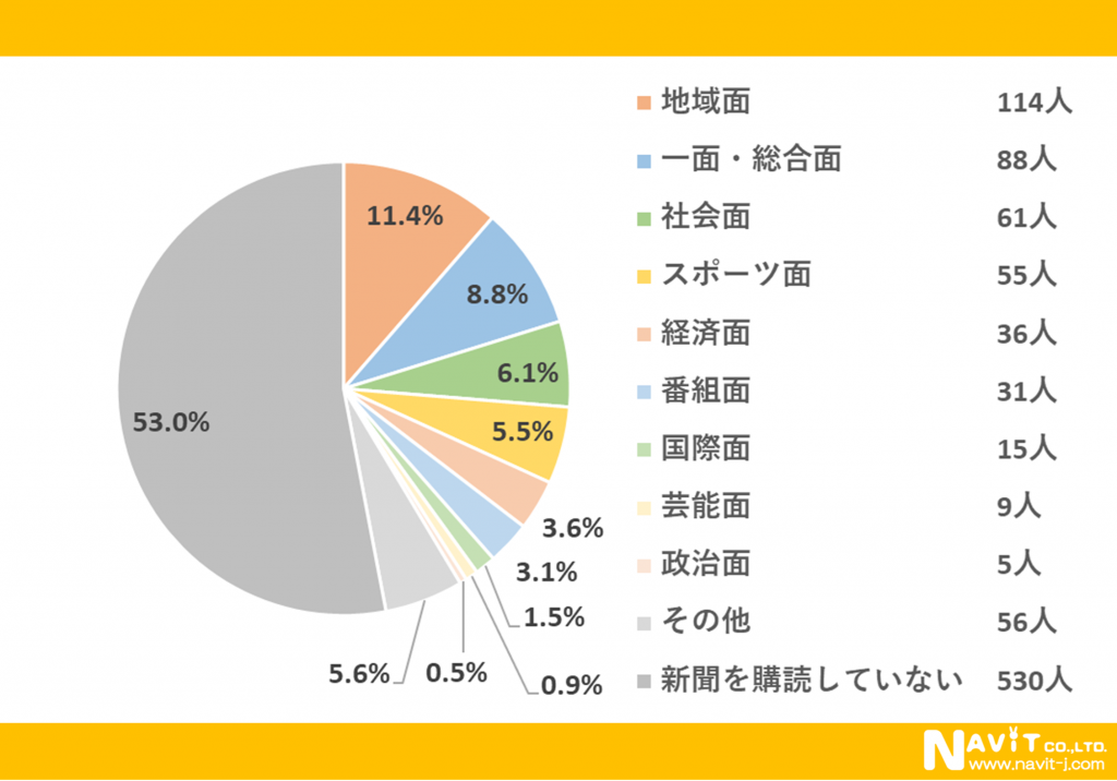 「最も好きな新聞の面・記事の種類はなんですか?」という質問については、「地域面」が11.4%、「一面・総合面」が8.8%、「社会面」が6.1%という順になりました。