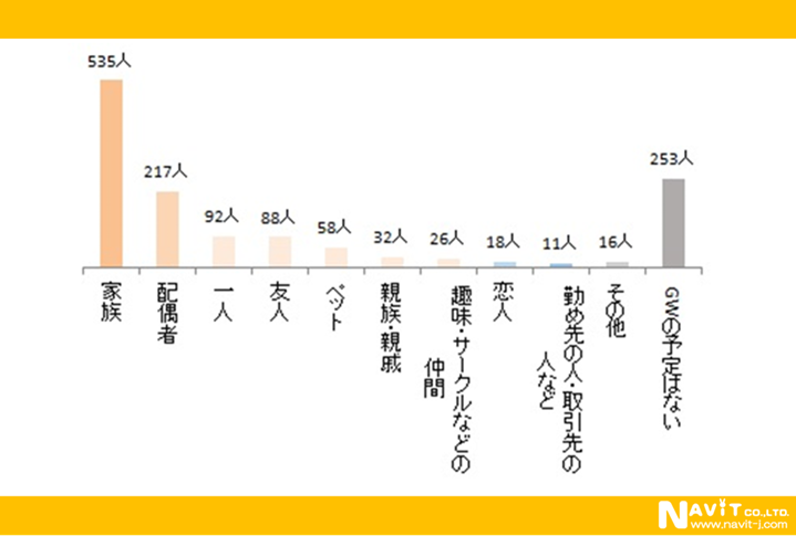 複数回答可で質問した連休を一緒に過ごす相手は「家族」がトップで535人。「配偶者」が2番目に多くて217人でした。