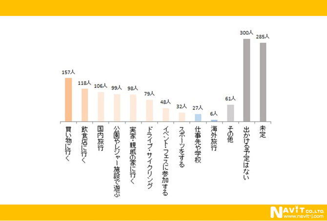 複数回答可で尋ねた外出の目的の上位は「買い物に行く」157人、「飲食店に行く」118人、「国内旅行」106人という結果となりました。