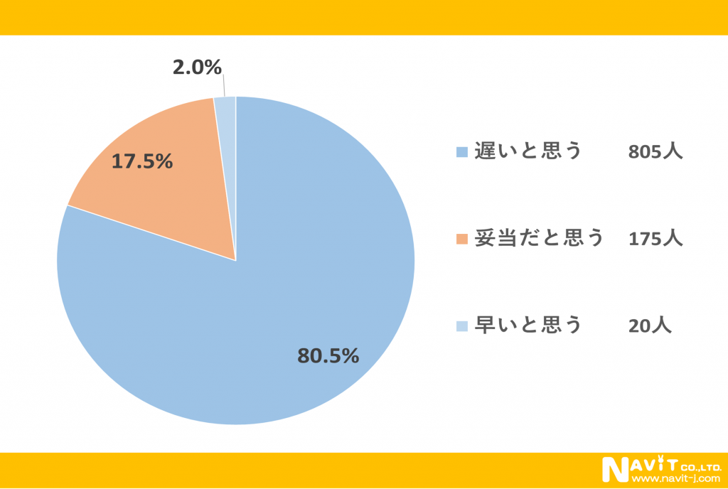 小林製薬が紅麹サプリを自主回収するまでにかかった期間についてのアンケートではかかった時間が「妥当だと思う」という回答が17.5%となっています。また、「早いと思う」と回答された人も2.0%いらっしゃいますが、80.5%の人は「遅いと思う」と回答されています。