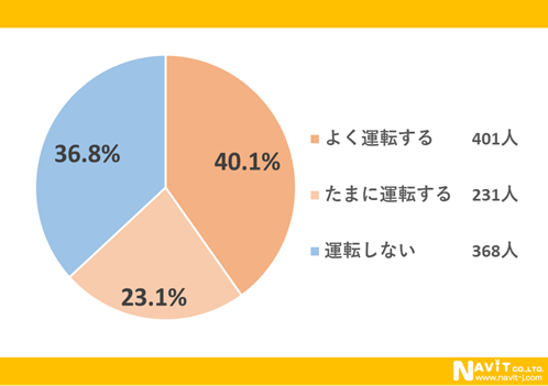 運転する頻度については「よく運転する」が最も多く40.1%、次いで「たまに運転する」が23.1%となりました。全体的に見て6割の人が運転をしていることがわかりました。
