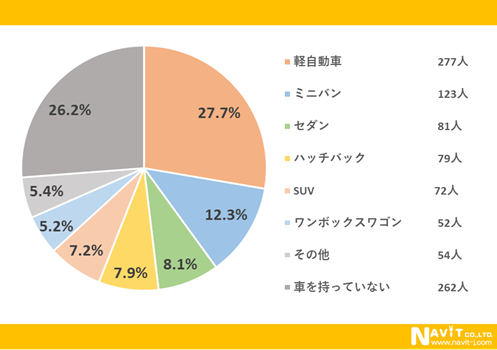 使用している車のボディタイプについては「軽自動車」がトップで27.7%となりました。次いで「ミニバン」で12.3%、「セダン」で8.1%と続きました。軽自動車は燃費が良く、維持費も安いため日本では人気のボディタイプとなっています。