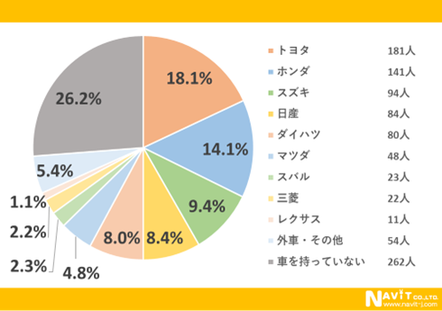 使用している車のメーカーについては「トヨタ」で18.1%と最も多かったです。続いて「ホンダ」で14.1%、「スズキ」で9.4%となりました。全体の約半数がこの3社が占めている結果が出ました。