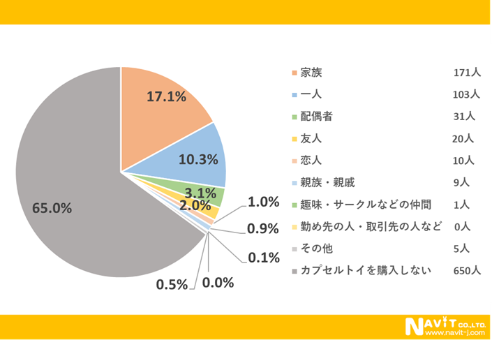 「誰と購入しに行きますか?」という質問については、「家族」が17.1%、「一人」が10.3%という結果になりました。家族とみんなで楽しむことができる、趣味として一人で楽しむことができるといったように、ガチャガチャの強みが結果に表れました。