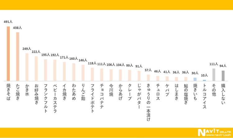 「屋台で食べ物を買ったことはありますか?」という質問を複数選択可能で行ったところ、「焼きそば」が491人、「たこ焼き」が438人、「かき氷」が249人という順になりました。