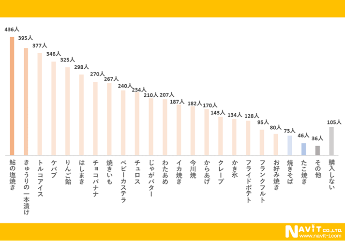 「屋台であまり購入しない食べ物は何ですか?」という質問を複数選択可能で行ったところ、「鮎の塩焼き」が436人、「きゅうりの一本漬け」が395人、「トルコアイス」が377人という順になりました。