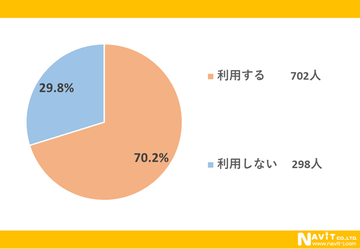 「コーヒーショップを利用しますか?」という質問については、「利用する」が70.2%、「利用しない」が29.8%という結果的になり、 コーヒーショップを利用する方は7割ということが分かりました。