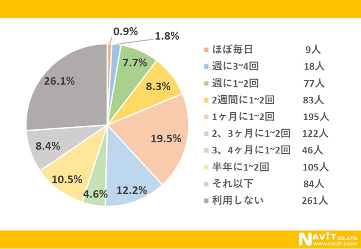 「どの頻度で利用しますか?」という質問については、 「1ヶ月に1~2回」が19.5%、「2、3ヶ月に1~2回」が12.2%と続く結果になりました。
