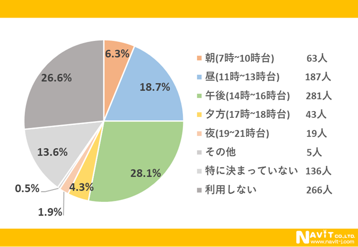 「午後(14時~16時台)」が28.1%、「昼(11時~13時台)」が18.7%という結果になりました。約半数の方がお昼から夕方頃に利用することが明らかになりました。