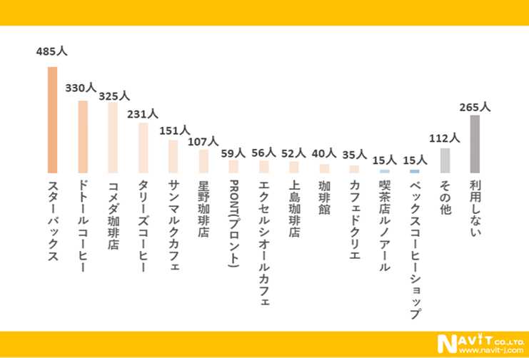 「どのお店を利用しますか?」という質問を複数回答で行ったところ、最も多かった回答は「スターバックス」で485人、次いで「ドトールコーヒー」で330人、「コメダ珈琲店」で325人という順になりました。