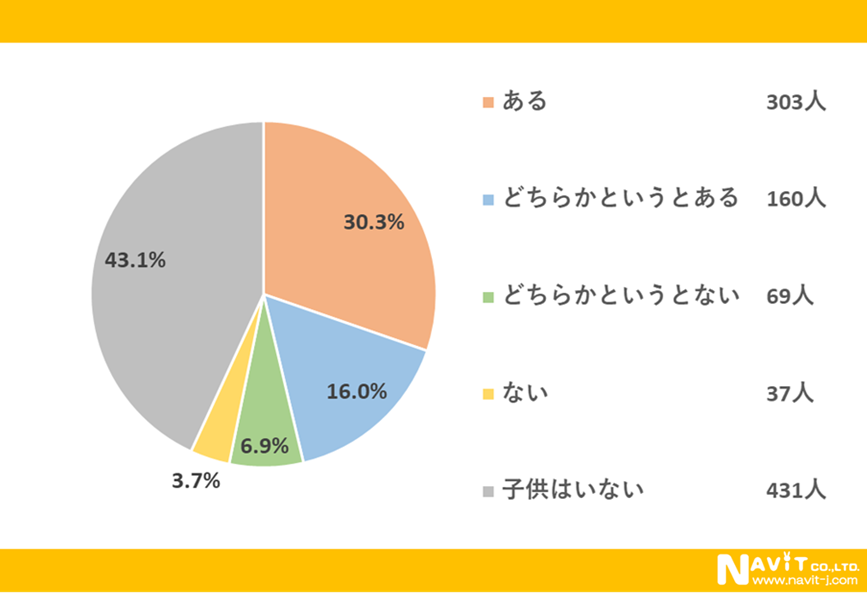 「子育てで困ったこと、不安だったことはありますか?」という質問については、「ある」が30.3%、「どちらかというとある」が16.0%という結果になり、合わせると46.3%の人が困ったことや不安だったことがあると回答しました。