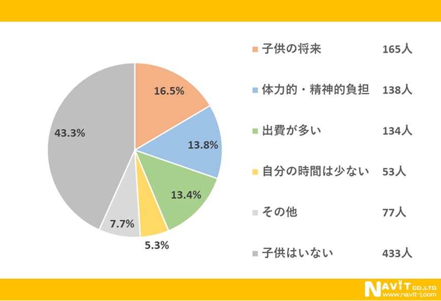 「特に子育てで困ったこと、不安だったことは何ですか?」という質問については、「子供の将来」が16.5%、「体力的・精神的負担」が13.8%、「出費が多い」が13.4%という順になりました。