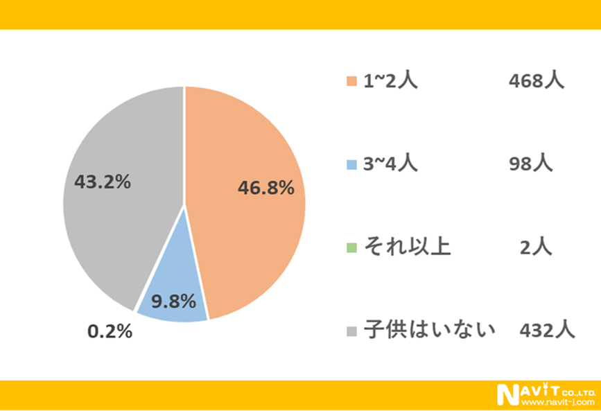 お子さんの人数については、「1~2人」が46.8%、「3~4人」が9.8%、「それ以上」が0.2%という順になりました。半数近くの方が、1~2人のお子さんがいらっしゃるようですね。
