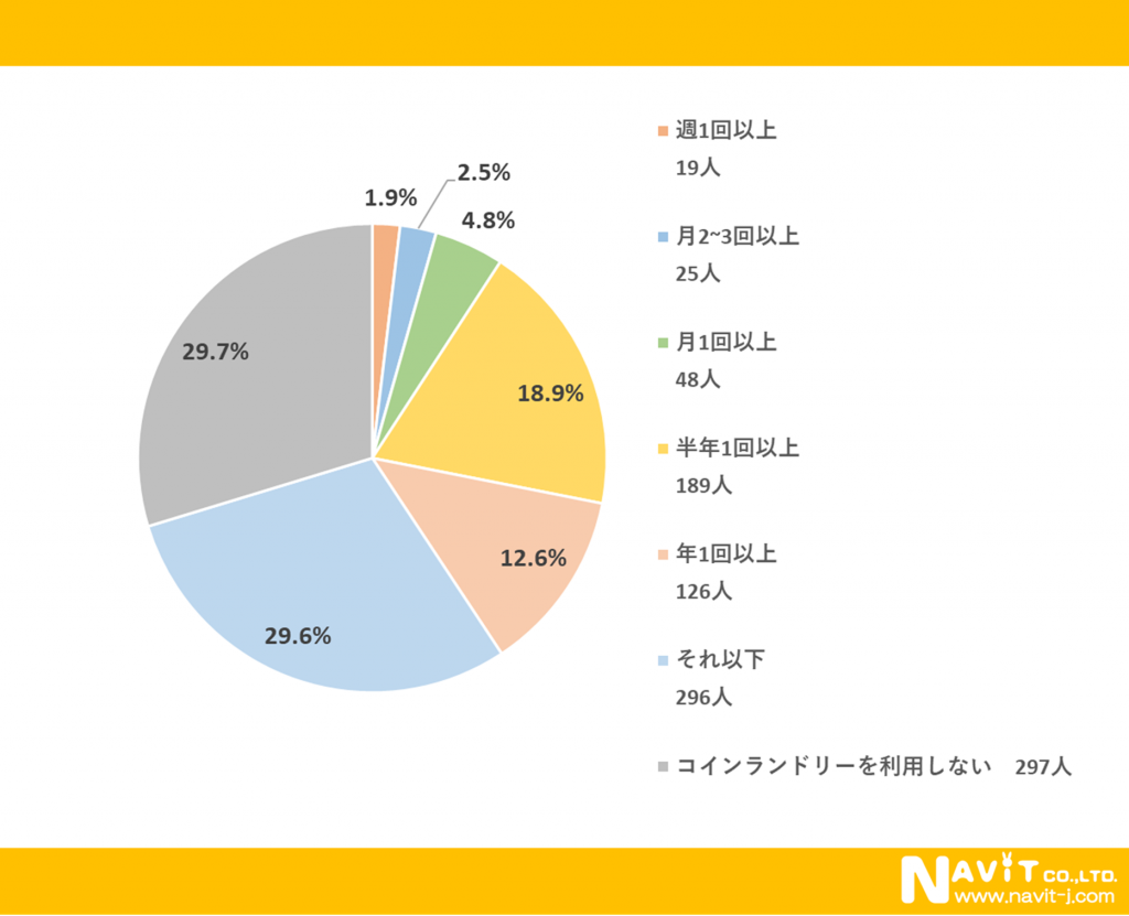 「コインランドリーをどのくらいの頻度で利用しますか?」という質問については、「(年1回)それ以下」が29.6%、「半年1回以上」が18.9%、「年1回以上」が12.6%と、利用頻度が少ない方が多いことがわかりました。