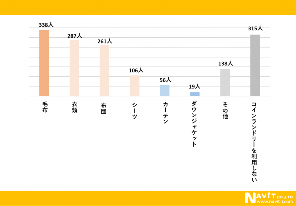 「コインランドリーでどんなものを洗いますか?」という質問を複数回答可で行ったところ、「毛布」が338人、「衣類」が287人、「布団」が261人という順になりました。家では洗いにくい大きなものを洗われている方が多いようですね。