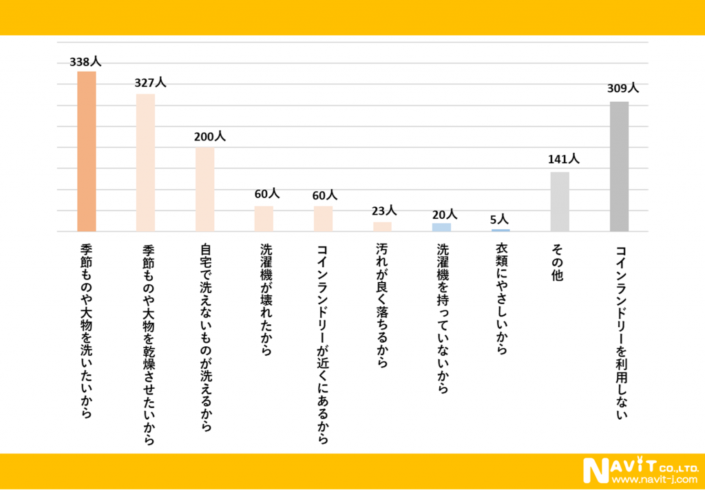 「コインランドリーを利用する理由は何ですか?」という質問を複数回答可で行ったところ、「季節ものや大物を洗いたいから」が338人、「季節ものや大物を乾燥させたいから」が327人、「自宅で洗えないものが洗えるから」が200人という順になりました。