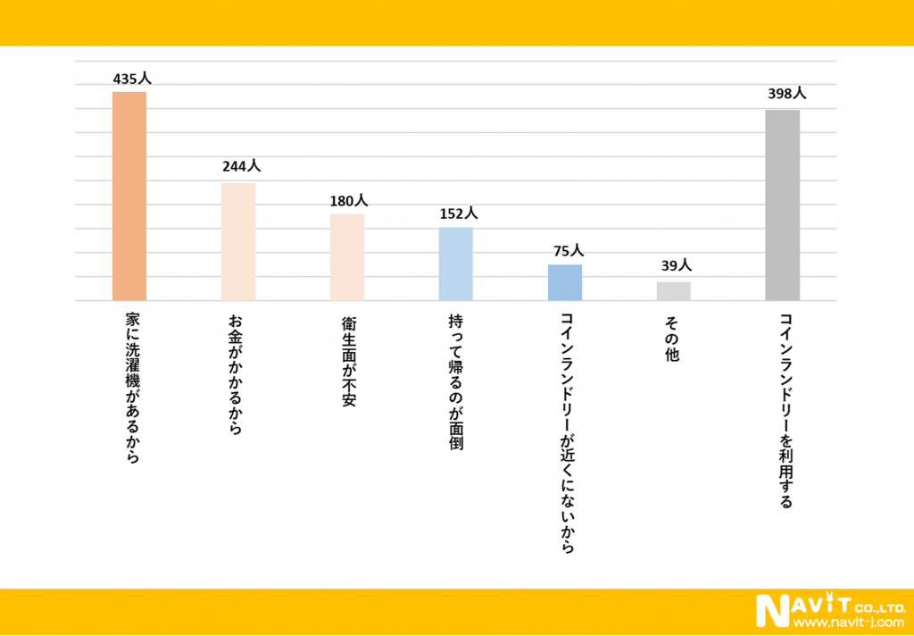 反対に、「コインランドリーを利用しない理由は何ですか?」という質問も複数回答可で行ったところ、「家に洗濯機があるから」が435人、「お金がかかるから」が244人、「衛生面が不安」が180人という順になりました。「家に洗濯機があるから」という理由が1番多いようですね。