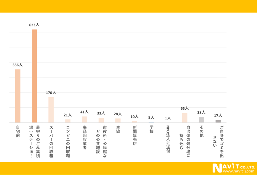 ゴミの回収をしてもらう場所について複数回答で尋ねたアンケートでは、一番多かった場所が「最寄りのゴミ集積場(ステーション)」で623人で次に多かったのは「自宅前」で356人、3番目に「スーパーの回収箱」が170人と続きました。