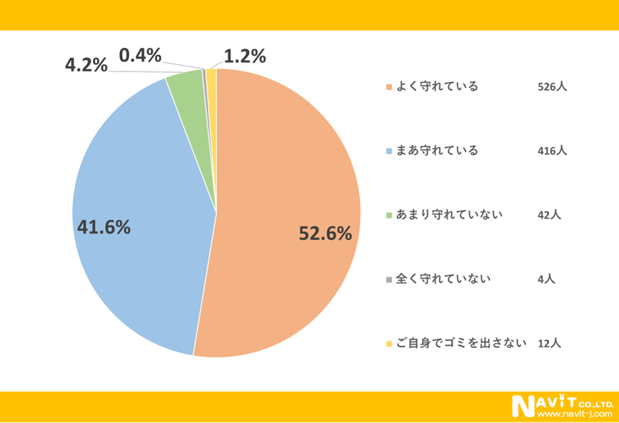 ゴミ分別の決まりを守れているかというアンケートに対して「よく守れている」と回答された人が52.6%で「まあ守れている」と回答された人が41.6%で合計で94.2%の人がゴミ分別のルールを守ることが出来ているようです。