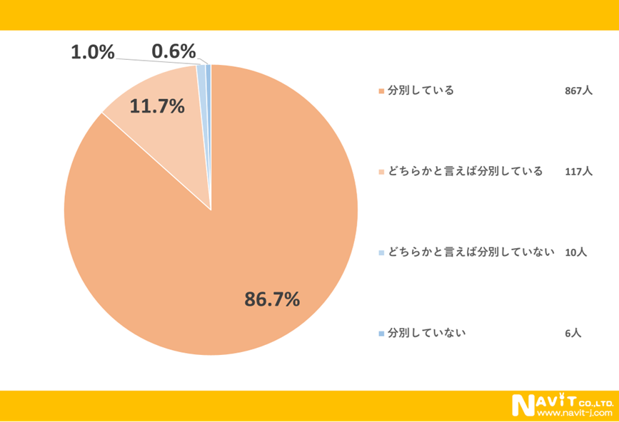 ゴミの分別を行なっているかというアンケートに対して、「分別している」と回答された人が86.7%で「どちらかと言えば分別している」という人が11.7%で合計すると98.4%の人が分別しているという結果になりました。