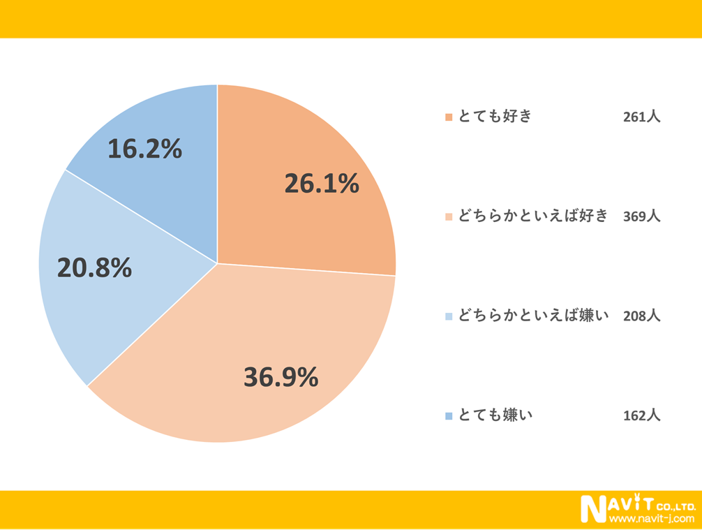 お酒は好きですか?というアンケートに対して「とても好き」と回答された人が26.1%で「どちらかといえば好き」と回答された人が36.9%で合わせて63.0%の人がお酒が好きだという結果になりました。