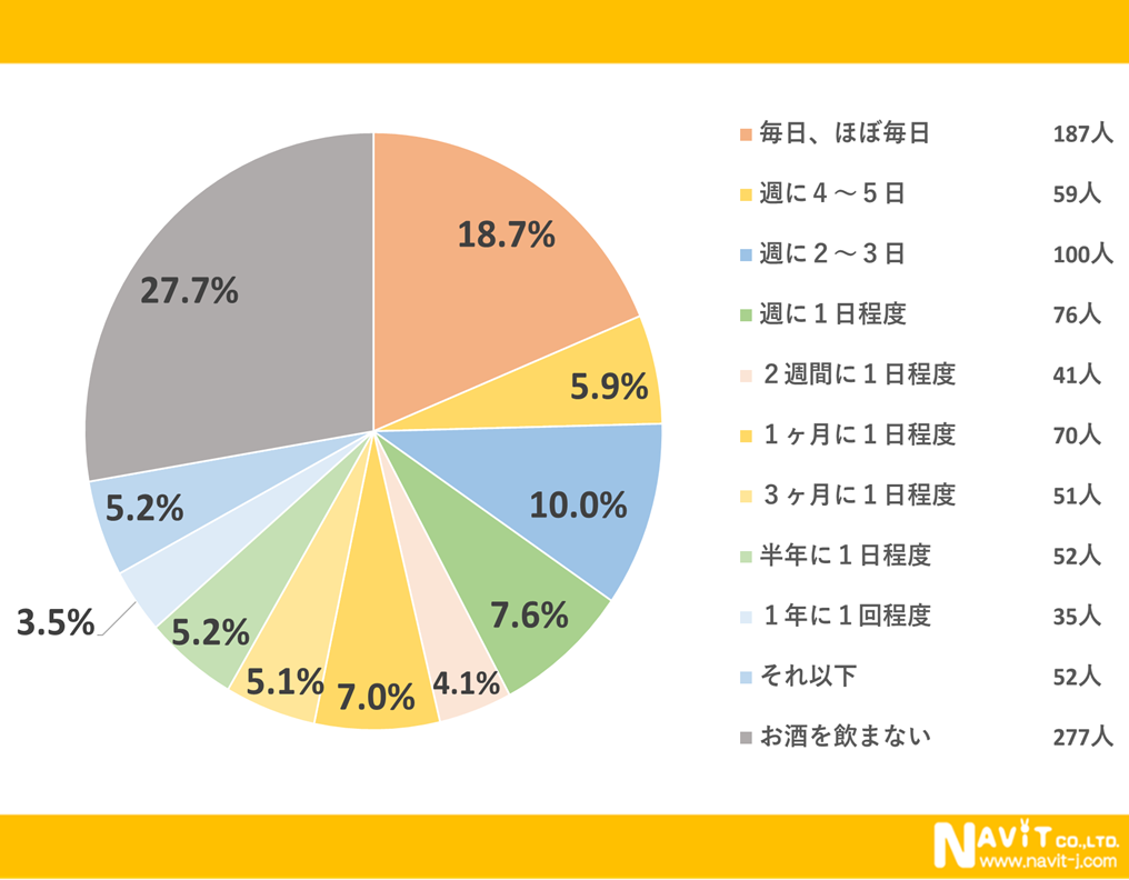 お酒を飲む頻度について尋ねたアンケートでは「毎日、ほぼ毎日」と回答された人が1番多く、18.7%という結果になりました。次に多かったのが「週に2〜3日」という人が10.0%で「週に1日程度」という人が7.6%という結果になりました。ちなみに筆者は毎日飲むのですが、週に1日以上お酒を飲む人は全体で36.3%で意外と少ないと思いました。