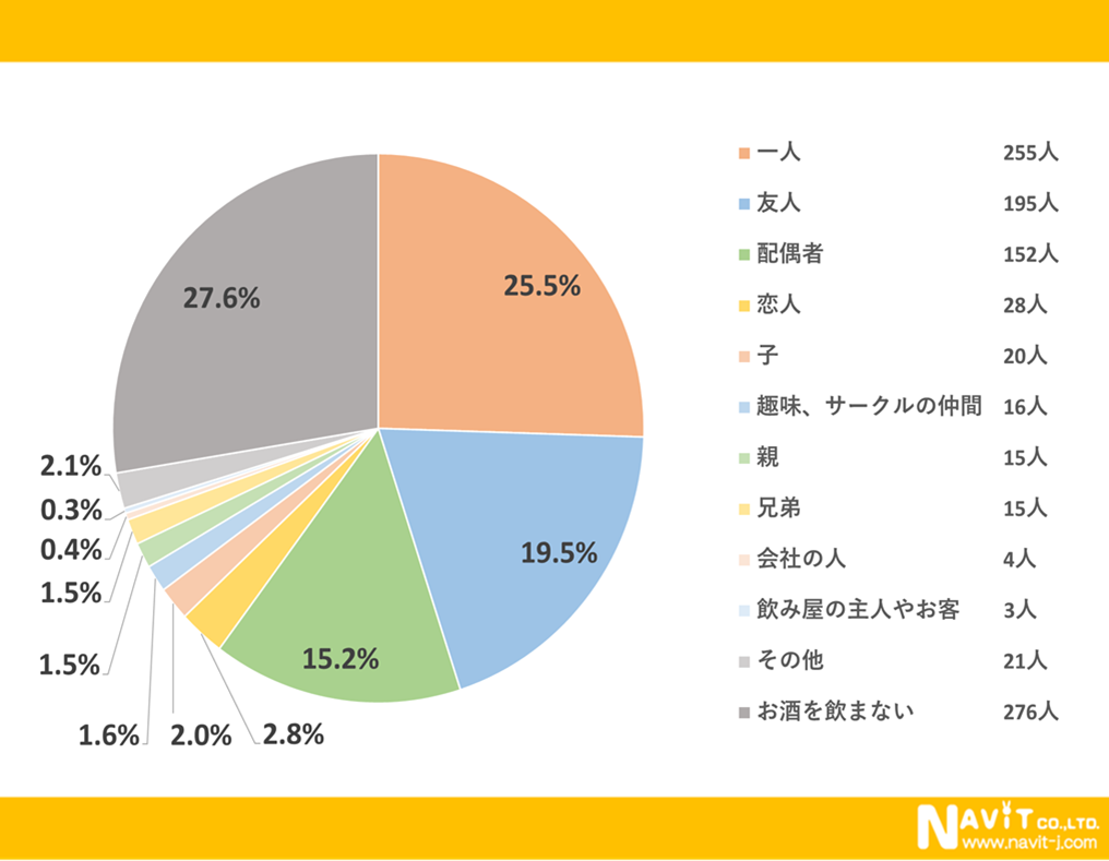 お酒を飲む時に誰と飲むとお酒が美味しいかについて尋ねたアンケートでは「一人」という人が1番多く25.5%という結果になりました。次に多かったのが「友人」で19.5%で3番目が「配偶者」で15.2%という結果になりました。