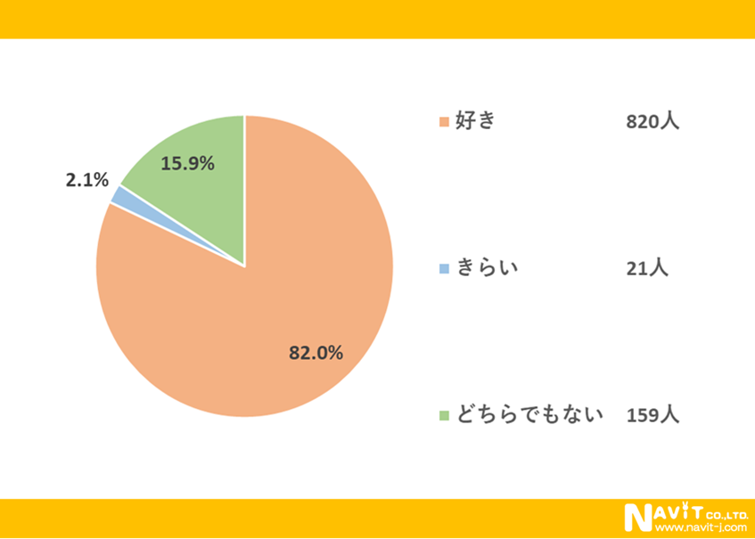 「ラーメンは好きですか?」という質問については、「好き」が82.0%、「きらい」が2.1%という結果になり、ラーメンが好きな人は約8割ほどだということが分かりました。