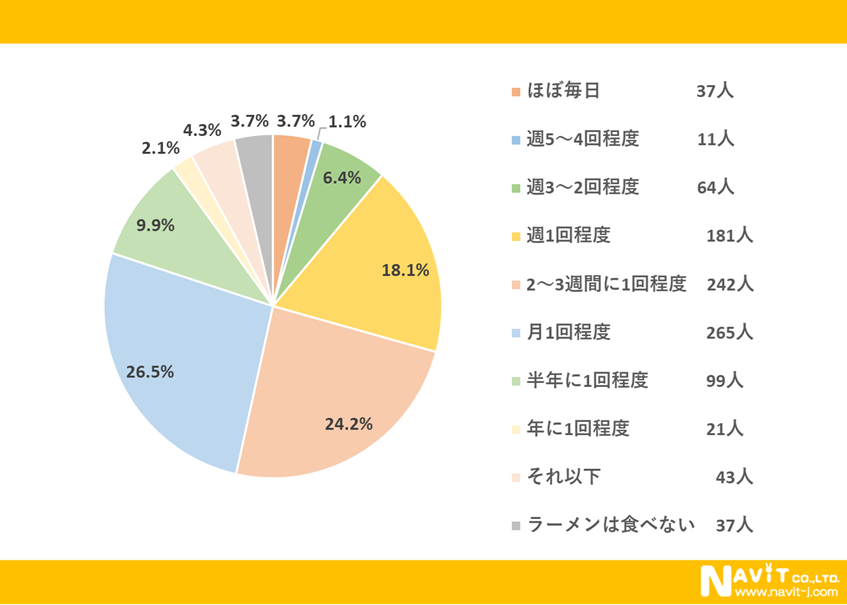 「ラーメンはどのくらいの頻度で食べますか?」という質問については、「月1回程度」が26.5%、「2~3週間に1回程度」が24.2%という結果になり、約半数の人が2週間~1か月に1回程度の頻度でラーメンを食べていることが分かりました。