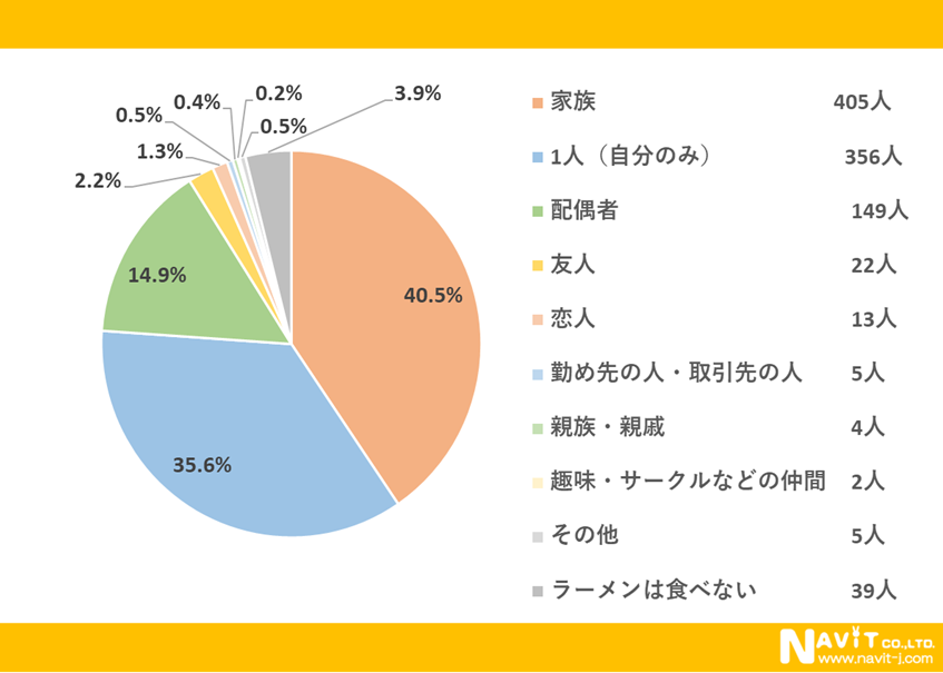 「ラーメンは誰と食べることが多いですか?」という質問については、「家族」が40.5%、「1人(自分のみ)」が35.6%、「配偶者」が14.9%という順になりました。ラーメンは家族と一緒に食べたり、1人で食べたりしている方が多いようですね。